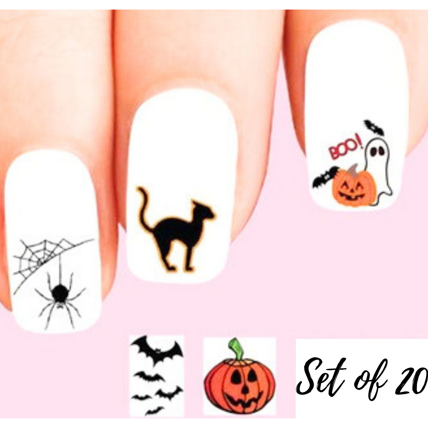 20 Assorted Halloween Nail Decals: Black Cat, Ghosts, Bats, Pumpkin & Spider Web
