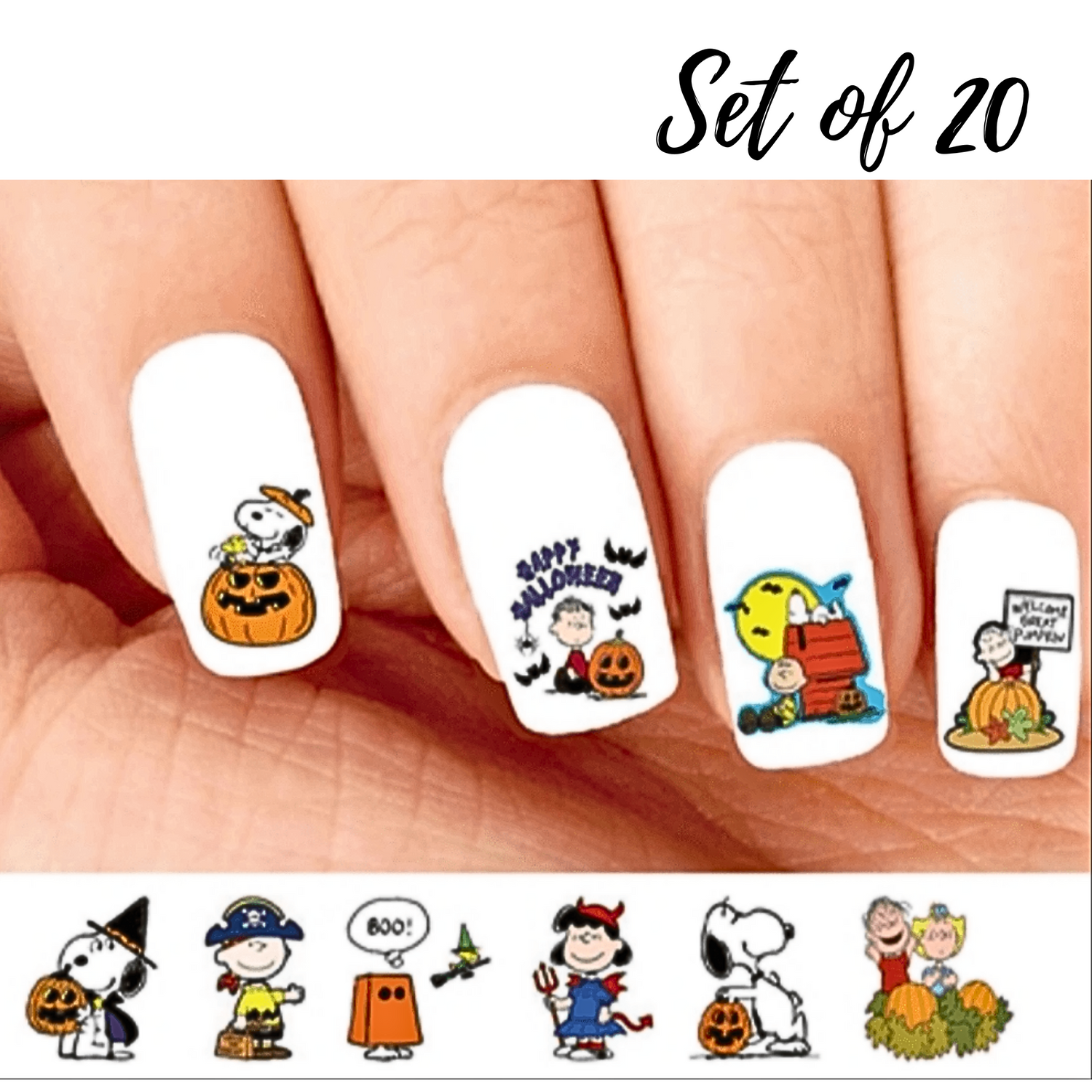 Halloween Charlie Brown Snoopy Nail Decals - Assorted Set of 20 Waterslide Designs for Festive Nail Art
