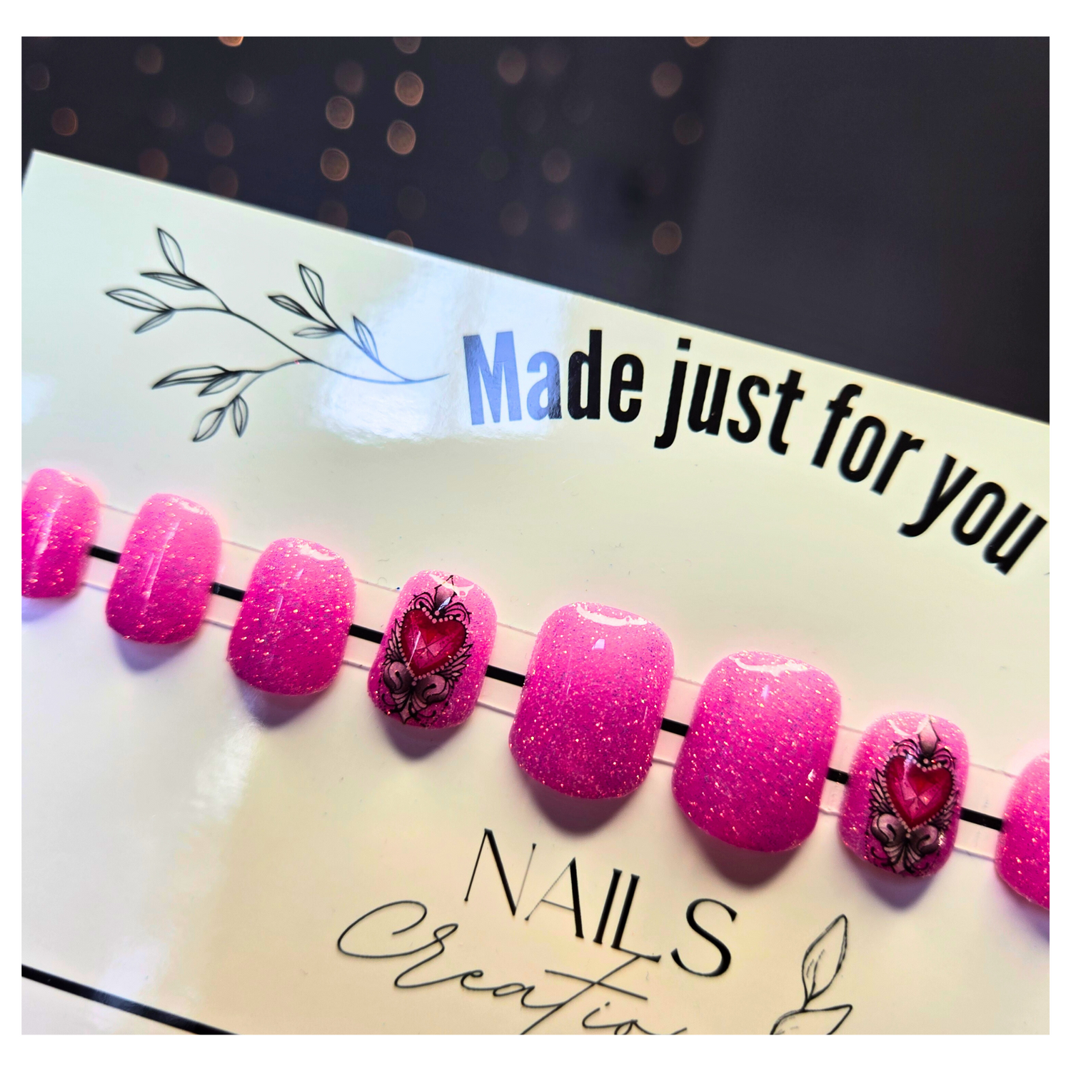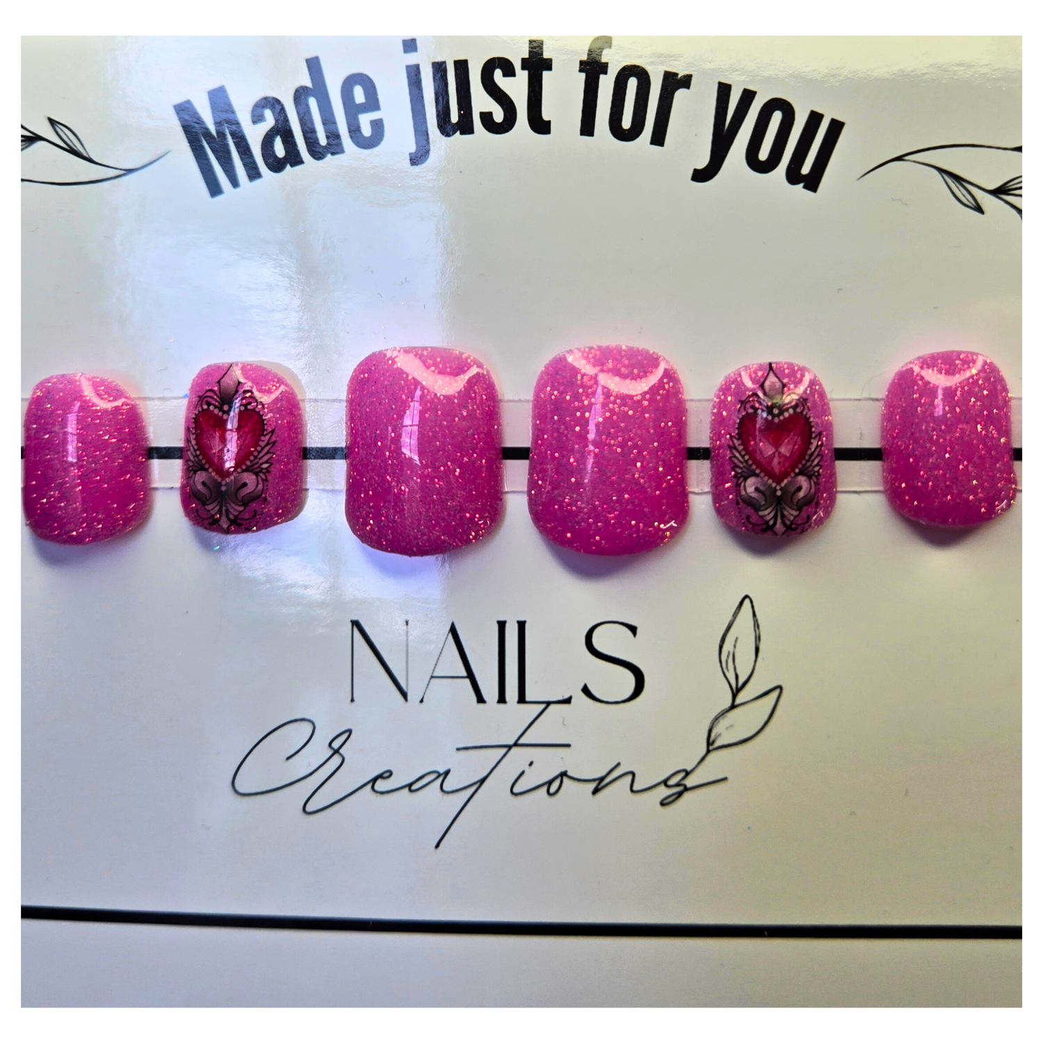 Medium Square Pink Heart Glitter Press On Nails - Full Custom Gel Kit