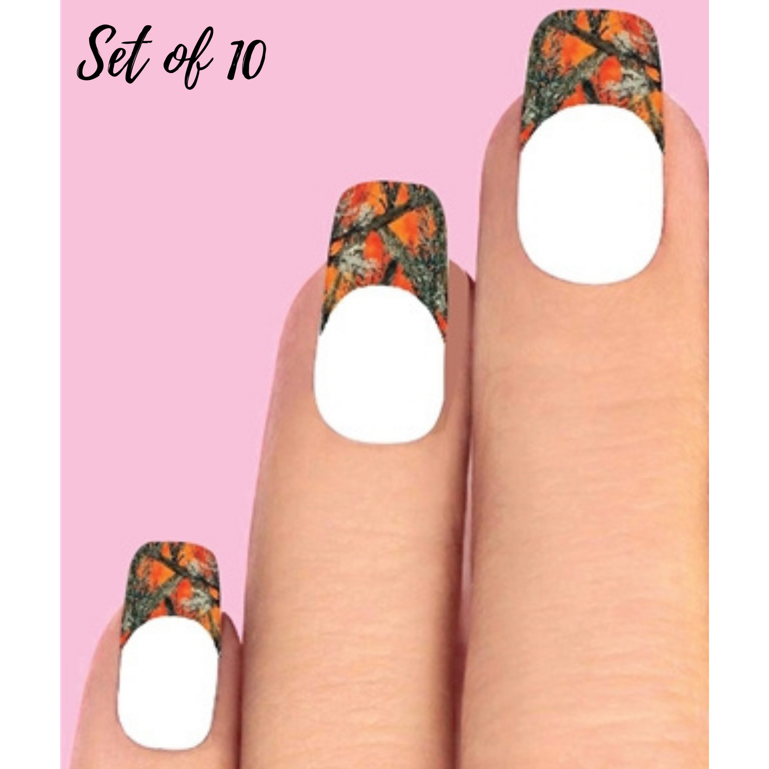 Orange Mossy Oak Camouflage Nail Tips - Waterproof Nail Decals - 10 Pcs